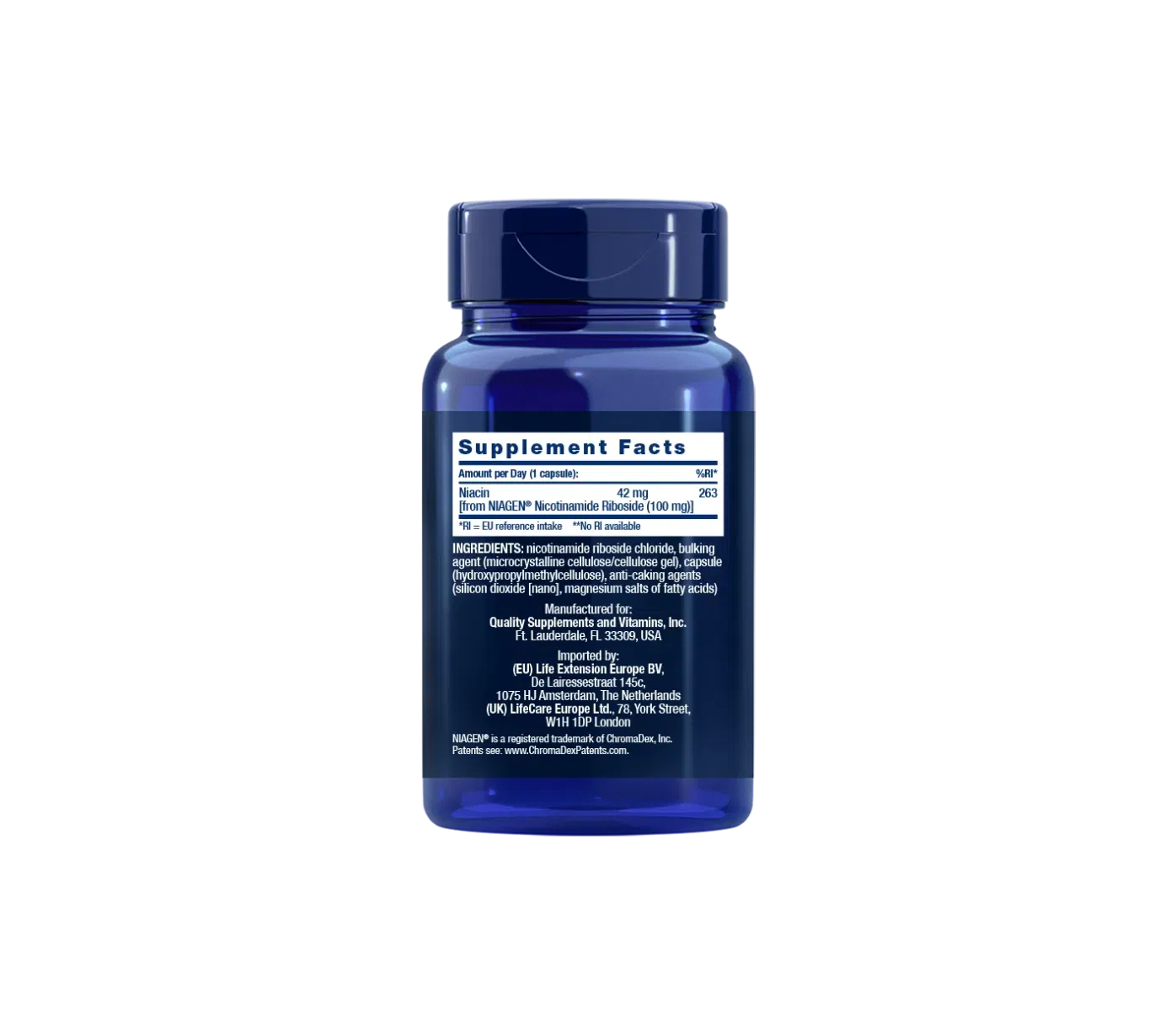 | Niacinas | 42 mg (iš NIAGEN® Nikotinamido ribozido 100 mg) | ** |